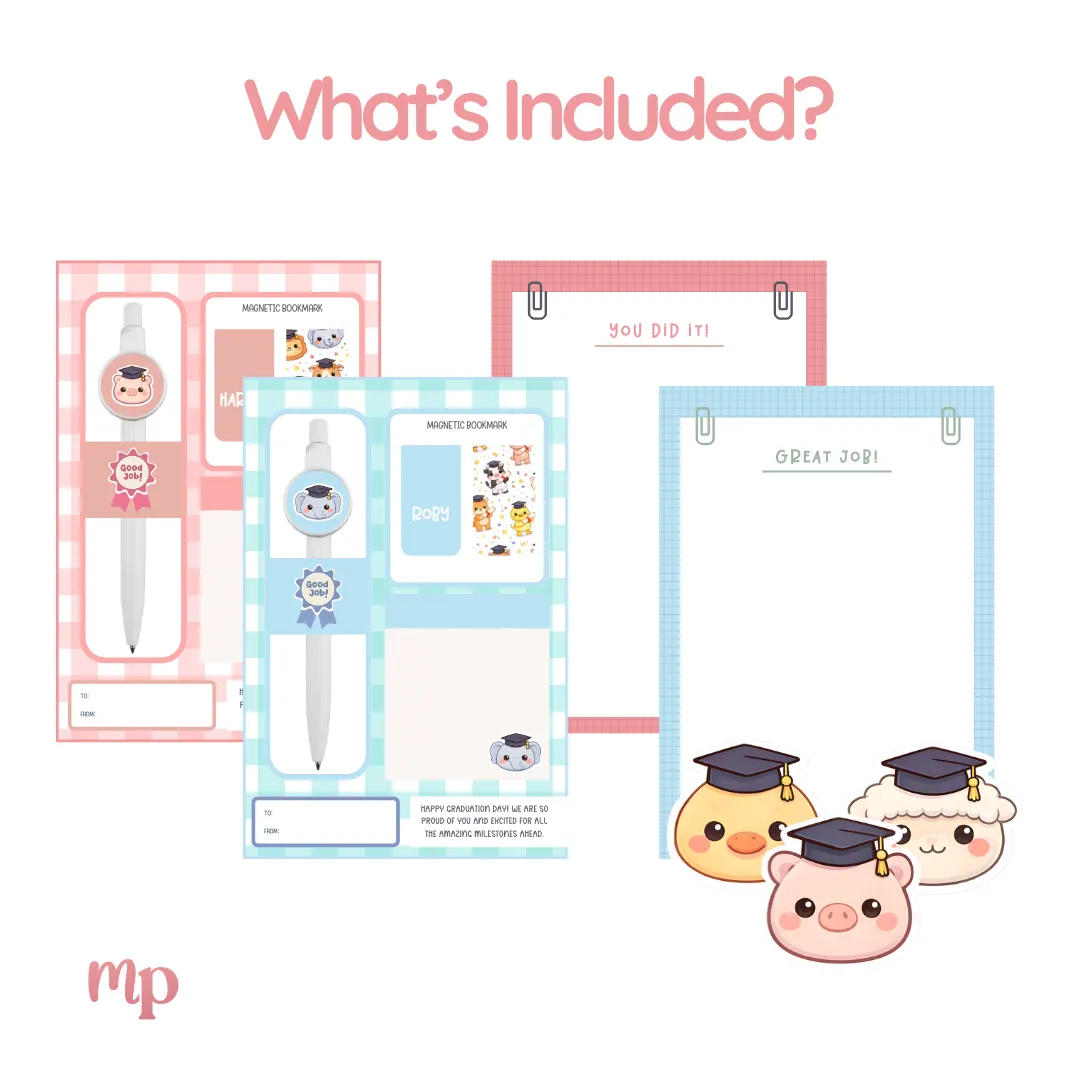 A cute and easy-to-edit Canva template set made for graduation giveaways, bookmarks, memo pads, pen sleeves, and more. Customize the colors, names, and messages to make each piece feel extra personal.